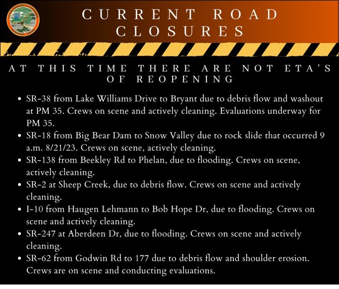 Most of the rain has ended and skies are slowly clearing. But, it may take a few days to shovel mountain and desert roads clear of mud and debris and make repairs. Troublespots have been concentrated in the Coachella Valley and the lower Banning Pass. Eastbound Interstate 10 was closed Monday morning at Haugen-Lehmann Way because of mudslides. Two lanes were reopened by Monday evening. Around the Windy Point area, northbound Route 111was also closed because of mudslides. Roads leading into Palm Springs including Indian Canyon were also closed because of flooding along the Whitewater River. Local emergencies were declared in Indio and Palm Springs because of flooding. 9-1-1 emergency lines were being restored Monday. Power is being gradually restored to areas of the Coachella Valley where high winds brought down utility poles. Fifty poles are being replaced in the Thermal area. Caltrans is clearing roads in the San Bernardino Mountains of mud, boulders and debris. Raging torrents tore down Sheep Creek near Wrightwood. Story Date: August 22, 2023
