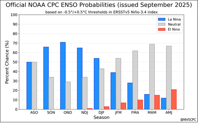 The Climate Prediction Center (CPC) puts the chances at of a La Nina at 71 percent through December. “Thereafter, La Niña is favored but chances decrease to 54% through February 2026”, the CPC predicted. The outlook is based on recently observed water temperature trends across the surface and subsurface equatorial Pacific. California’s so-called ‘rainy season’ runs from November through March. Story Date: September 15, 2025