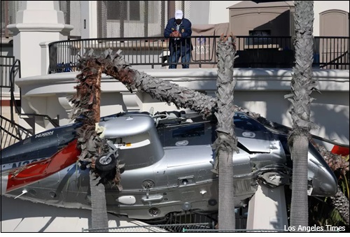 HUNTINGTON BEACH – Authorities removed the wreckage of a helicopter from the steps of a pedestrian bridge in Huntington Beach on Monday, Oct. 13th. The incident sent five people to the hospital, including a child.