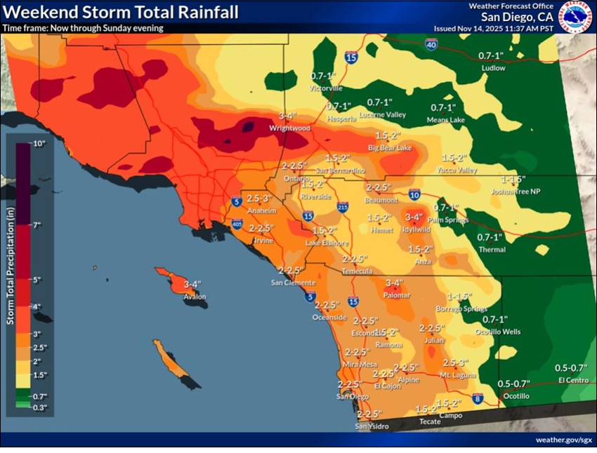 The storm delivered rain as advertised but little snow because of its subtropical origins. Rainfall totals to 7pm Saturday: Lytle Creek 4.60 Mt. Baldy 4.28 San Bernardino 1.45 Riverside 1.53 Ontario 1.56 Temecula 1.18 Apple Valley .70 Palm Springs 1.11 A weaker storm system, currently in the Gulf of Alaska, could add more rain showers and a better chance of snowfall for the mountain resorts Monday and Tuesday. Model guidance is in better agreement on the timing of this system producing a line of light to moderate intensity rain showers by late Monday morning into the afternoon. Still another could reach the Southland by next Thursday and Friday. There is no indication the warm, dry weather of last month will return anytime soon. https://radar.weather.gov/station/KSOX/standard Story Date: November 17, 2025