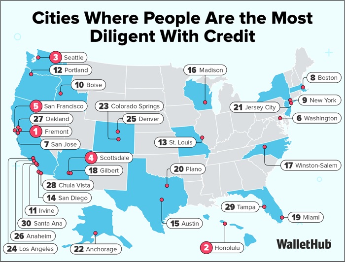 WalletHub used six metrics in its comparison of 100 cities: • Percentage of Customers who have collections tradelines • Percentage of frozen credit reports • Percentage of customers who have missed payments • Percentage of customers who have active bankruptcies • Percentage of customers who have foreclosures • Percentage of customers who have filed a dispute Fremont, CA, is the city where people are the most diligent with credit, boasting the lowest percentage of people who missed payments. San Francisco and San Jose rank among the top-ten. At the bottom of the list are Memphis, Birmingham, Alabama and Detroit. Story Date: December 4, 2025