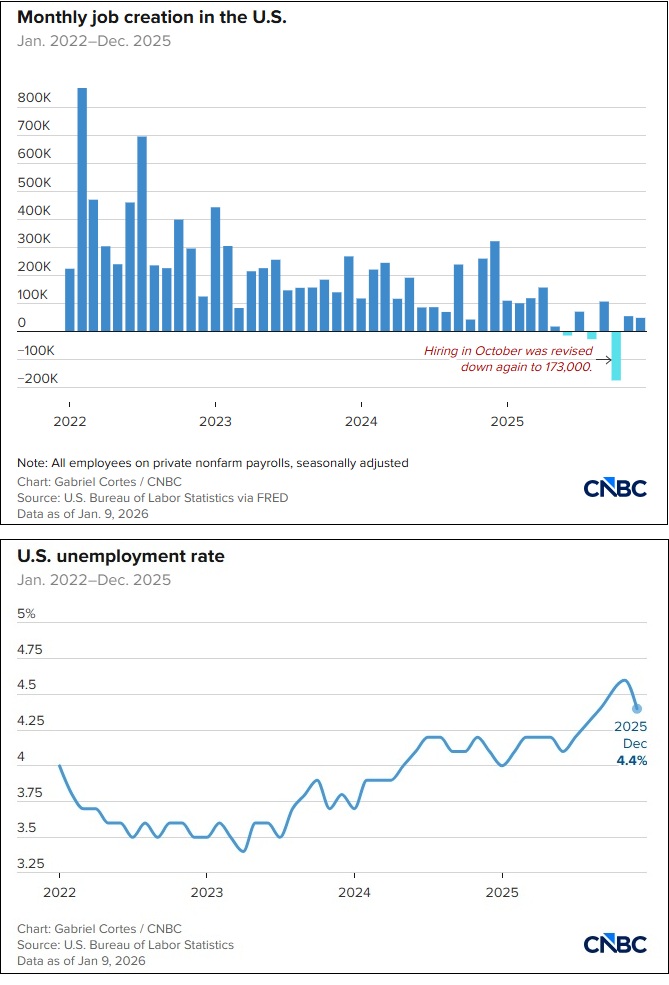 Nonfarm payrolls rose a seasonally adjusted 50,000 for the month, lower than the downwardly revised 56,000 in November and short of the Dow Jones estimate for 73,000. At the same time, the unemployment rate fell to 4.4%, compared with the forecast for 4.5%. A more encompassing measure that includes discouraged workers and those holding part-time jobs for economic reasons dropped to 8.4%, down 0.3 percentage point from November. The household survey, which is used to calculate the unemployment figures, showed an increase of 232,000 while the labor force participation rate edged lower to 62.4%. The report presented a muddy view of the labor market, with companies reporting a low level of hiring but households showing employment gains. In addition, revisions brought totals down for the prior months. The November total saw a slight downward revision of 8,000 to the payrolls number, while October’s loss was even more than originally reported, now at 173,000 compared with the prior estimate of 105,000. For the full year, payroll gains averaged 49,000 a month, compared with 168,000 in 2024, according to the BLS. “The jobs report is a mixed bag, with both positive and negative aspects,” said Art Hogan, chief market strategist at B. Riley Wealth. “We continue to see an environment where companies are slow to hire and slow to fire. The overarching takeaway in today’s report is that there is more good news than bad in the first on-time jobs report in three months.” Restaurant and bar jobs led the month, rising 27,000, while health care added 21,000 and social assistance increased by 17,000. Retail reported a decline of 25,000. Government added just 2,000 jobs for the month. Average hourly earnings rose 0.3% for the month, in line with the forecast, although the annual increase of 3.8% was 0.2 percentage point higher than expected. The average workweek edged lower to 34.2 hours. Federal Reserve officials have been watching the jobs picture closely for guidance on the future path of interest rates. (Source: CNBC) Story Date: January 10, 2026