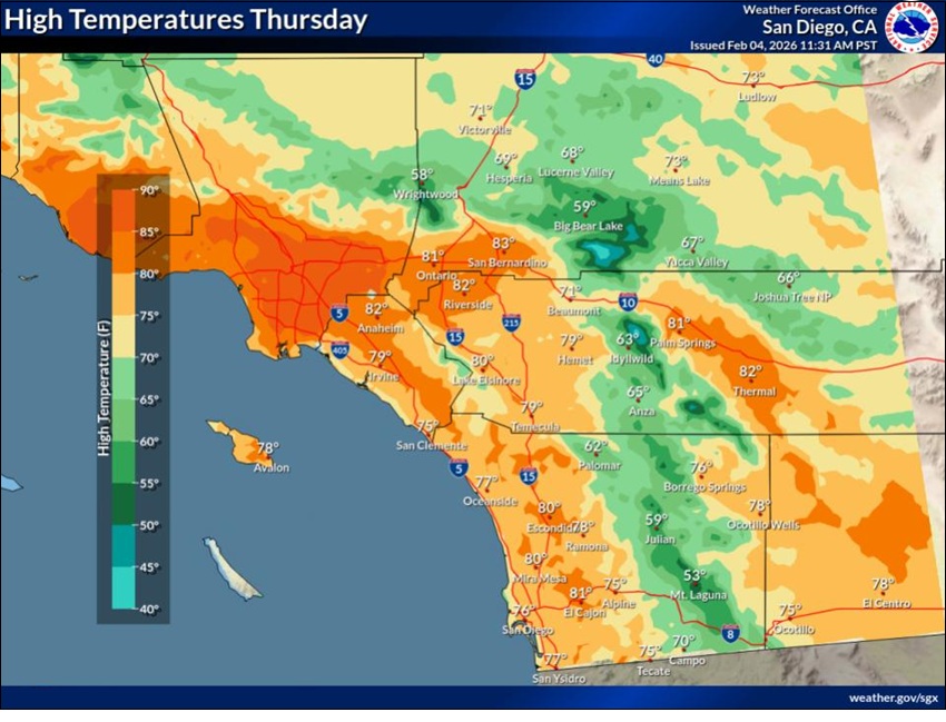 Some potential weather changes are aimed at Southern California from two directions. One weather system off the Baja Coast may bring enough clouds to create a slight chance of rain over the mountains through Friday. Temperatures are still running about 10-15 degrees above seasonal averages. The weekend will bring a brief dry warming trend ahead of another Pacific weather system. By next Tuesday, the Southland could be exposed to another shot at rain and cooler temperatures. Forecasters are expressing little confidence in the timing and amounts of precipitation. But, the more amplified low pressure trough is bearing widespread precipitation, mainly over and west of the mountains. Story Date: February 5, 2026