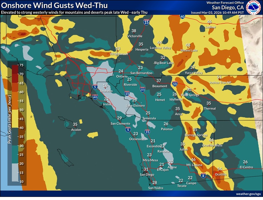 There will be stronger and gusty west winds each afternoon and evening in the mountains and deserts. Gusts of 35 to 45 mph are likely in the wind-prone areas. An Air Quality Alert has been issued until Tuesday because of blowing dust in the Coachella Valley. Dry and a little warmer weather is on deck after mid-week. There is no rain in the 7-day outlook for Southern California. Story Date: March 4, 2026